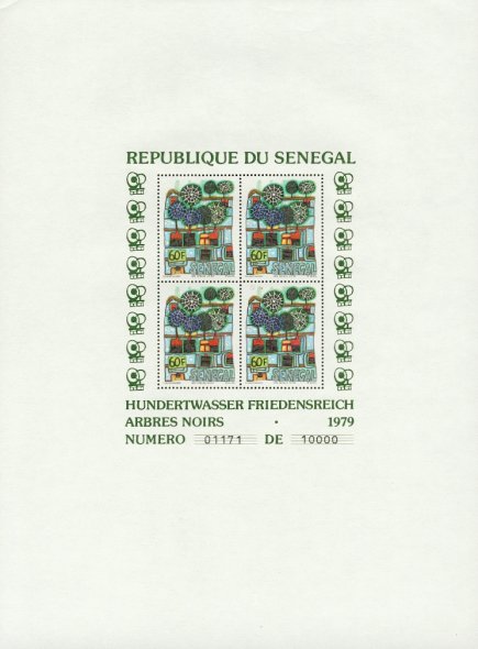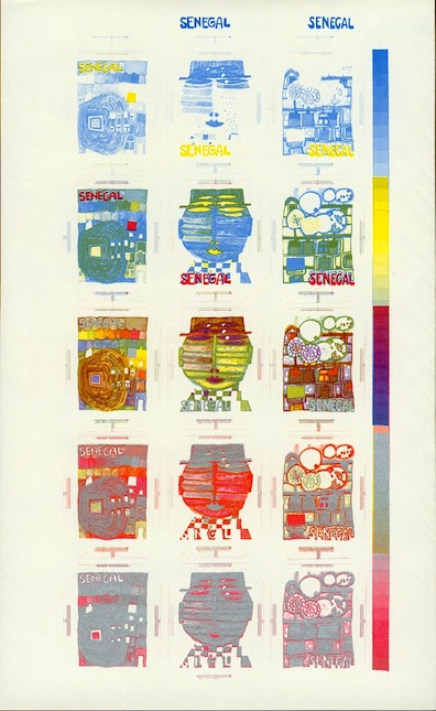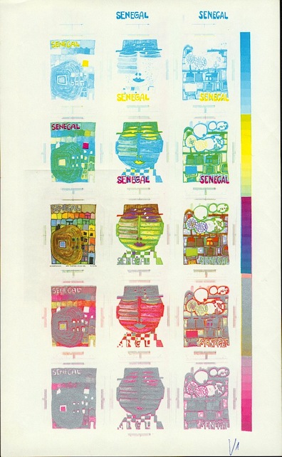 The Senegal stamps are as well documented as Austria’s Spiral Tree, with the added bonus of the printing process being captured in printer’s proofs in collectors hands. There are 5 different ones that I know of (although I only own the 4 shown here). It’s very interesting to see how each color field comes together for the final version.